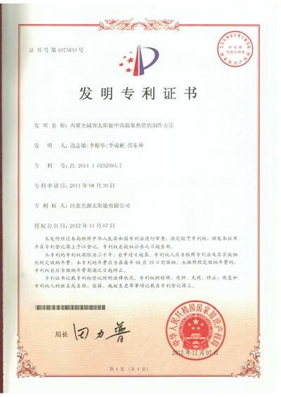 发明专利证书--内聚光减容太阳能中高温集热管的制作方法