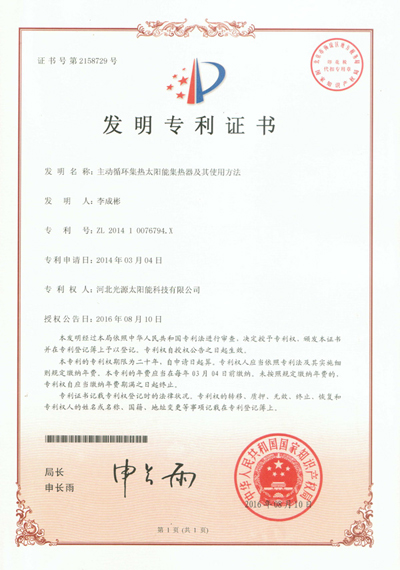 发明专利证书--主动循环集热太阳能集热器及其使用方法