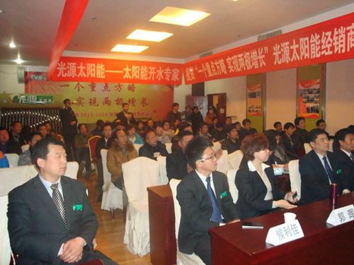 本次会议以“一个重点方略,实现两极增长”为主题,热水器营销事业部部长郭晖女士分析了公司良好的发展平台和发展优势,对当前太阳能行业现状及前景进行了缜密的解析,讲解了光源品牌的定位和行业的发展趋势。市场部经理侯利佳系统介绍了光源的发展史、行业地位,从行业完整的产业链到优越的产品性能等方面阐述了光源太阳能的产品优势,增强了经销商对光源太阳能产品的信心?;嵋榘才帕私?个小时的时间由安康银浩商贸有限公司总经理潘德银针对光源太阳能工程的产品进行了详细的分析和安装指导,与会经销商就太阳能单机、太阳能工程的优势和未来市场的运作等问题同公司人员进行了深入的沟通。