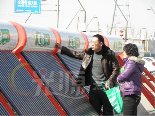 阳光明媚下的晋中是那么引人注目,60多台光源太阳能在逸園大酒店广场展现光源气势,引来了四面八方的新老客户,现场新老朋友对光源产品质量表示了肯定,青花瓷的水箱,紫金波纹集热真空管,让新老朋友赞不绝口。