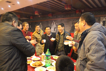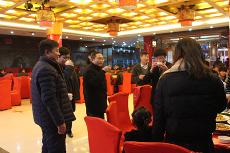 晚会结束后,春节晚宴开始。董事长李成彬、总经理刘迎波与公司领导来到员工中间,向员工敬酒,祝贺新年。