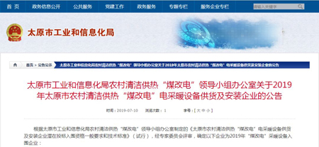 原市工业和信息化局农村清洁供热“煤改电”领导小组办公室关于2019年太原市农村清洁供热“煤改电”电采暖设备供货及安装企业的公告
