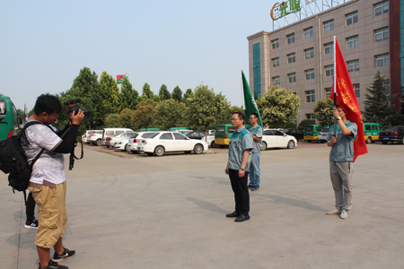 图一:(爱凡杰集团代表携旗帜进入我厂区)