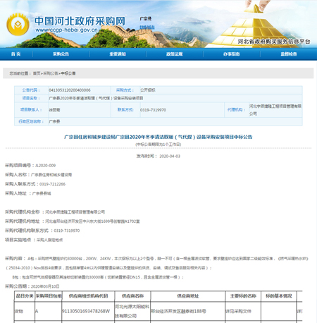 广宗县2020年冬季清洁取暖(气代煤)设备采购安装项目中标