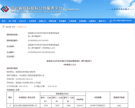 日前,河北省招标投标公共服务平台网发布了“临西县2020年农村地区冬季清洁取暖项目”公告中,光源春壁挂炉成功中标。
