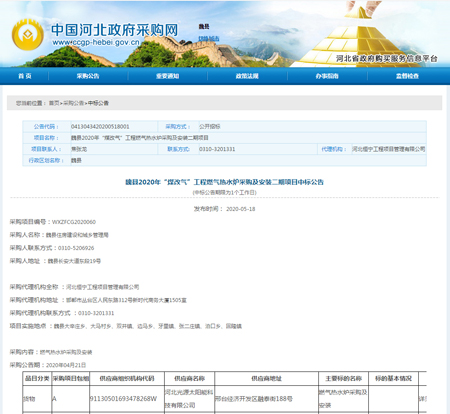 魏县2020年“煤改气”工程燃气热水炉采购及安装二期项目